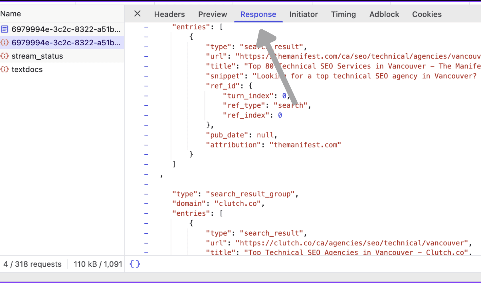 Other entries like stream_status or textdocs are not what you need. Click on the row with the curly braces icon and your conversation ID, then proceed to the Response tab.
