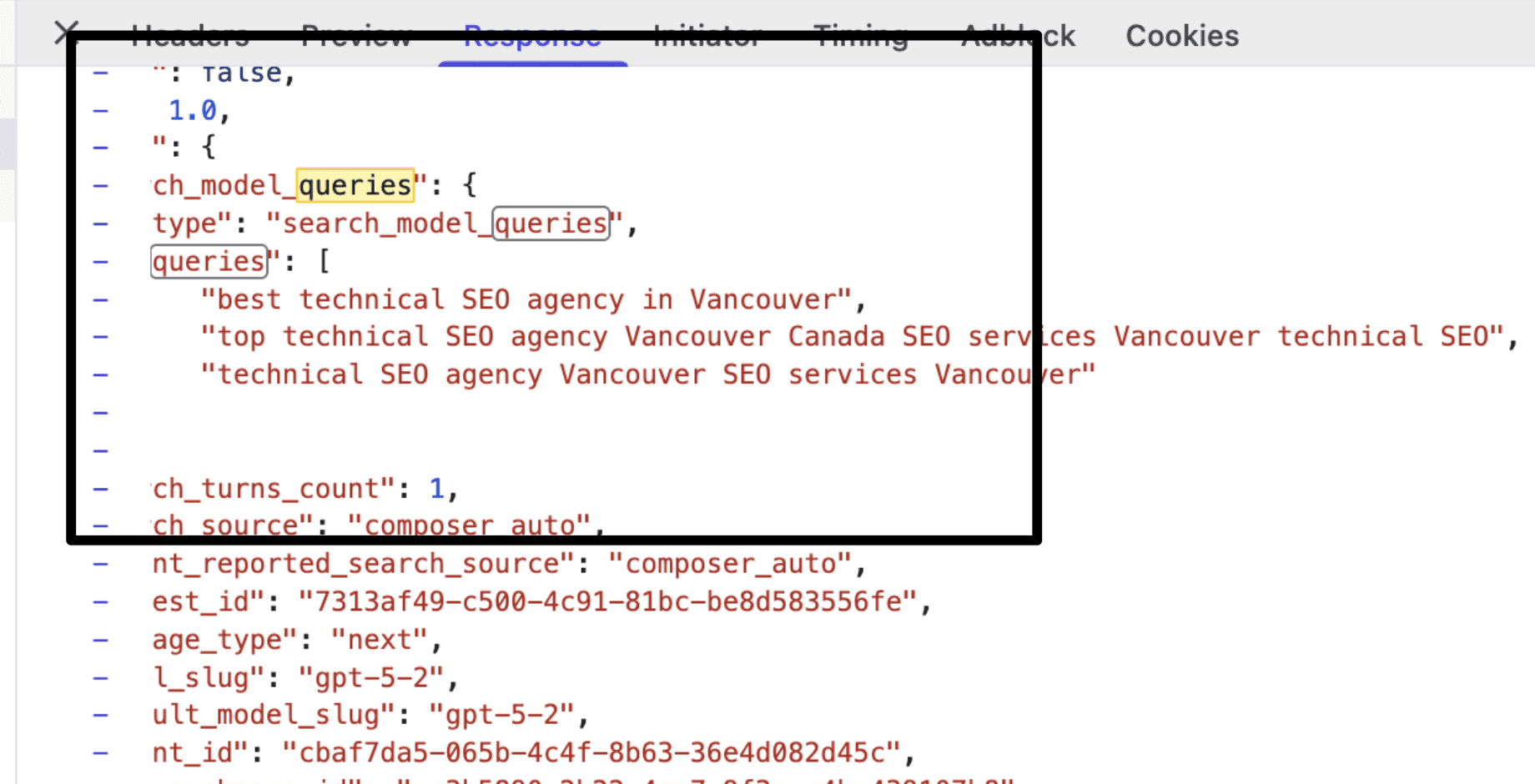 Look at the queries ChatGPT generated for "best technical SEO agency in Vancouver":