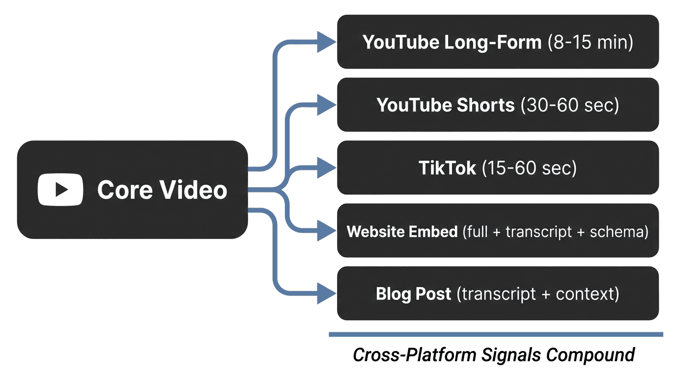 One video should serve five channels. A unified distribution strategy (YouTube long-form, Shorts, TikTok, website embed, blog post) compounds discovery signals across every platform.