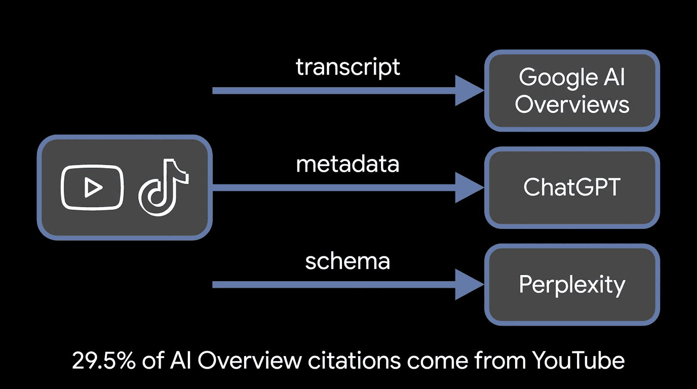 Here is the part most brands miss entirely. AI systems are not just answering questions with text. They are pulling from video content, and YouTube is leading the way.